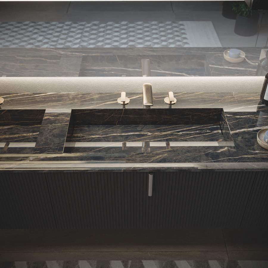 Πολύτιμο και φιλόξενο, αλλά ταυτόχρονα αυστηρό και λογικό, με ένα συναρπαστικό παιχνίδι φωτός μεταξύ των καθρεφτών LUX4 και της μονάδας τοίχου. Απελευθερώστε τη δημιουργικότητά σας. Σκούρο αλλά ζεστό, στολισμένο με λαβές ορείχαλκου ART, το μπροστινό μέρος του VERTIGO ταιριάζει αποτελεσματικά με το φινίρισμα της κορυφής του stoneware. Ένα πολύτιμο παιχνίδι με ζεστές και αποκλειστικές αποχρώσεις, ανάμεσα στην κορυφή, το ντουλάπι και τους μίκτες νερού.
