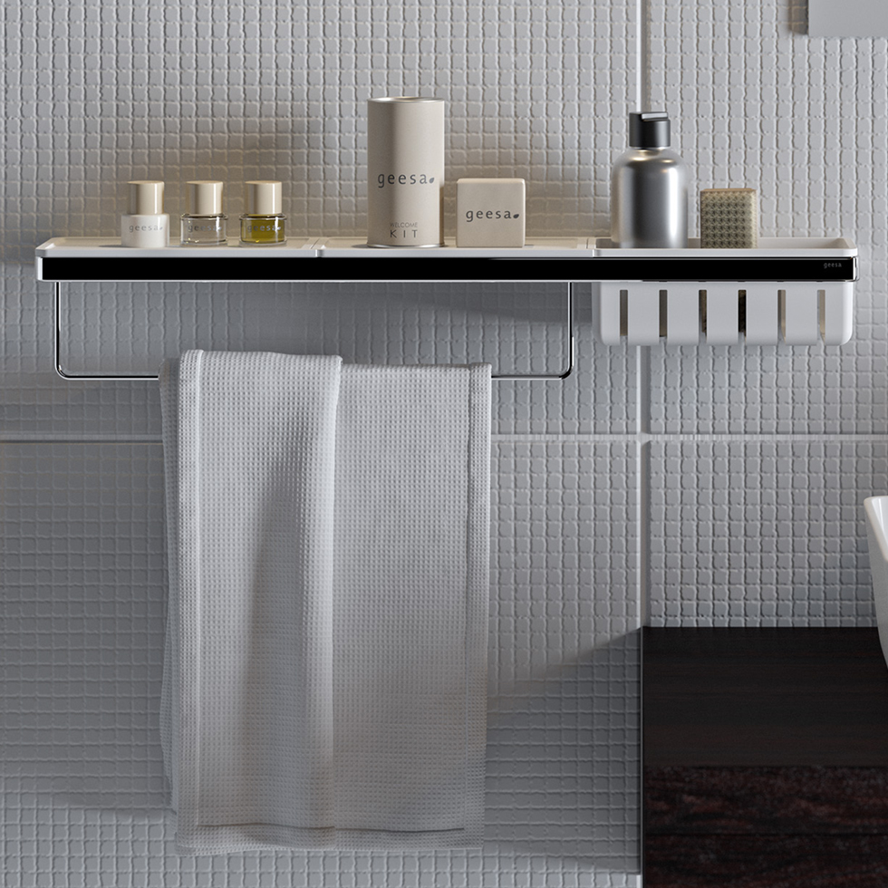 | DESCRIPTION: | reversible bathroom shelf 63x10,8x10,5 cm with towel rail, removable cases and drainage slots |