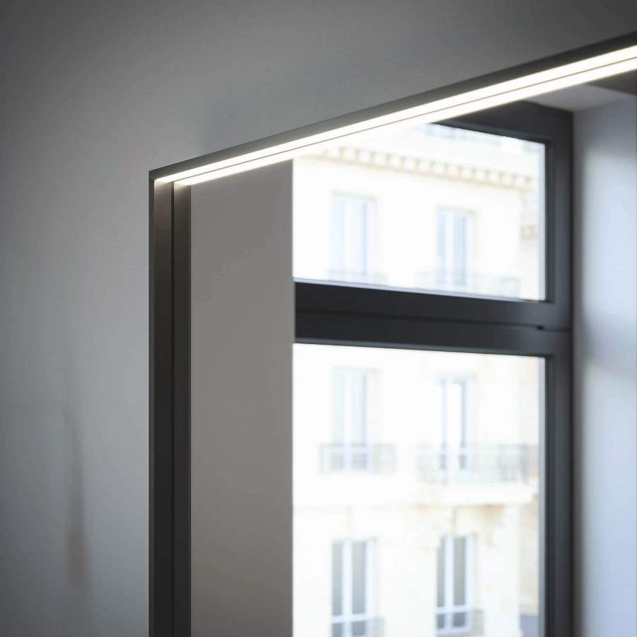 VERTIGO can become a decorative element that, wisely dosed, creates extraordinary effects, merging with the other PUNTOTRE collections. In this composition it meets MODULA and plays with the contrasts between glossy and matt. A High Tech mirror, with a matt black aluminium profile, which can be equipped with lighting and managed to various specifications, this is the new BLACK mirror. In detail we appreciate the capacious Tecnoril top basin and the targeted contrast with the “total black” of the mixer group, ideally connected to the handle.
