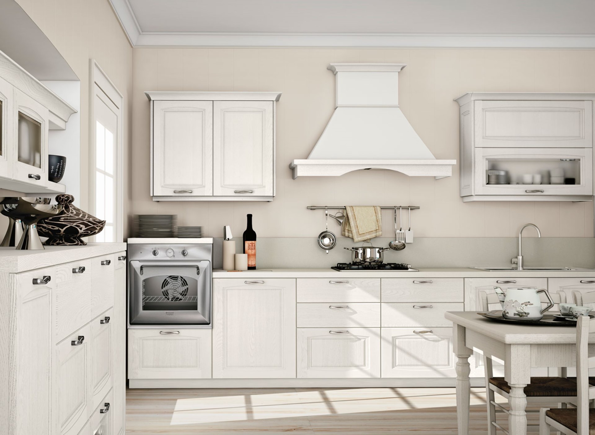 A nod to tradition, and another to innovation. Raila is both traditional and modern, giving you a warm welcome while making light work of everyday chores in the kitchen. Here the base units and columns have doors in openpore powder grey lacquered ash, while the wall units have doors in camellia white lacquered ash.