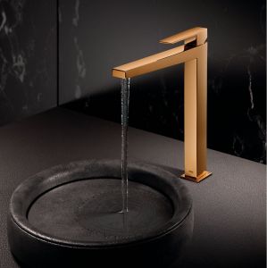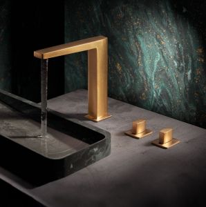 Stone sinks, or marble or ceramic surfaces are elegant and natural when complemented by gold matte faucets.